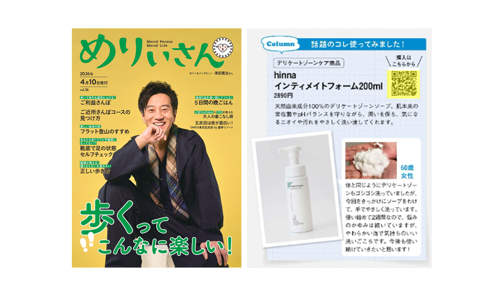 「めりぃさん」vol.36に掲載されました 2026.04.16 ブランドニュースメディア掲載 めりぃさん(vol.36)に掲載されました。 ■概要 出版社:ては~とホールディングス株式会社 ■掲載商品 hinna インティメイトフォーム 商品はこちら