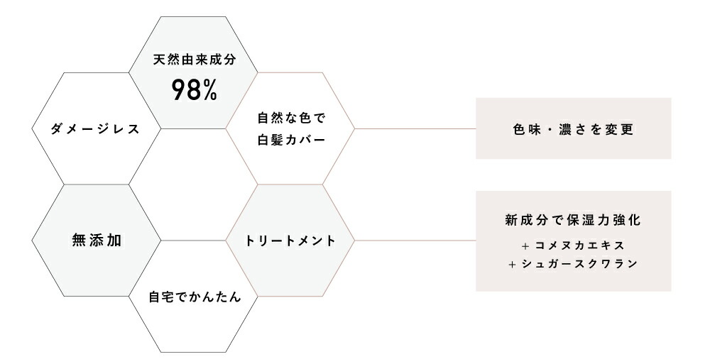 白髪のカラーリング*に新しい選択を。 自然派&手軽なクリームジェル。 * 染料の浸透による物理的な着色効 | |