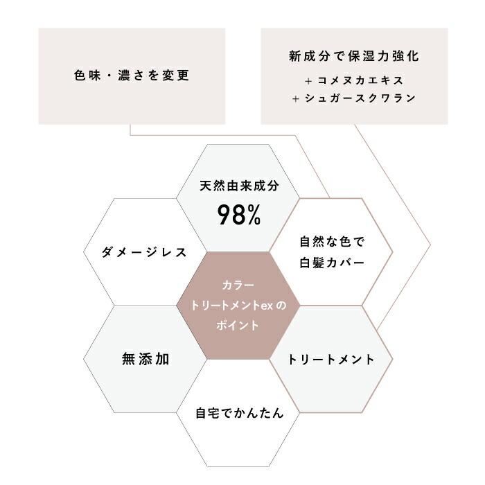 ![]() 使うたびに自然な色付け -もっと濃くなりました-ナチュラルな染料で髪の内側と表面を色づけるカラートリートメントex。 ⇒様々な髪色になじむ3色のラインナップ ※1-2回使用した際のイメージです。髪質により個人差があります。
