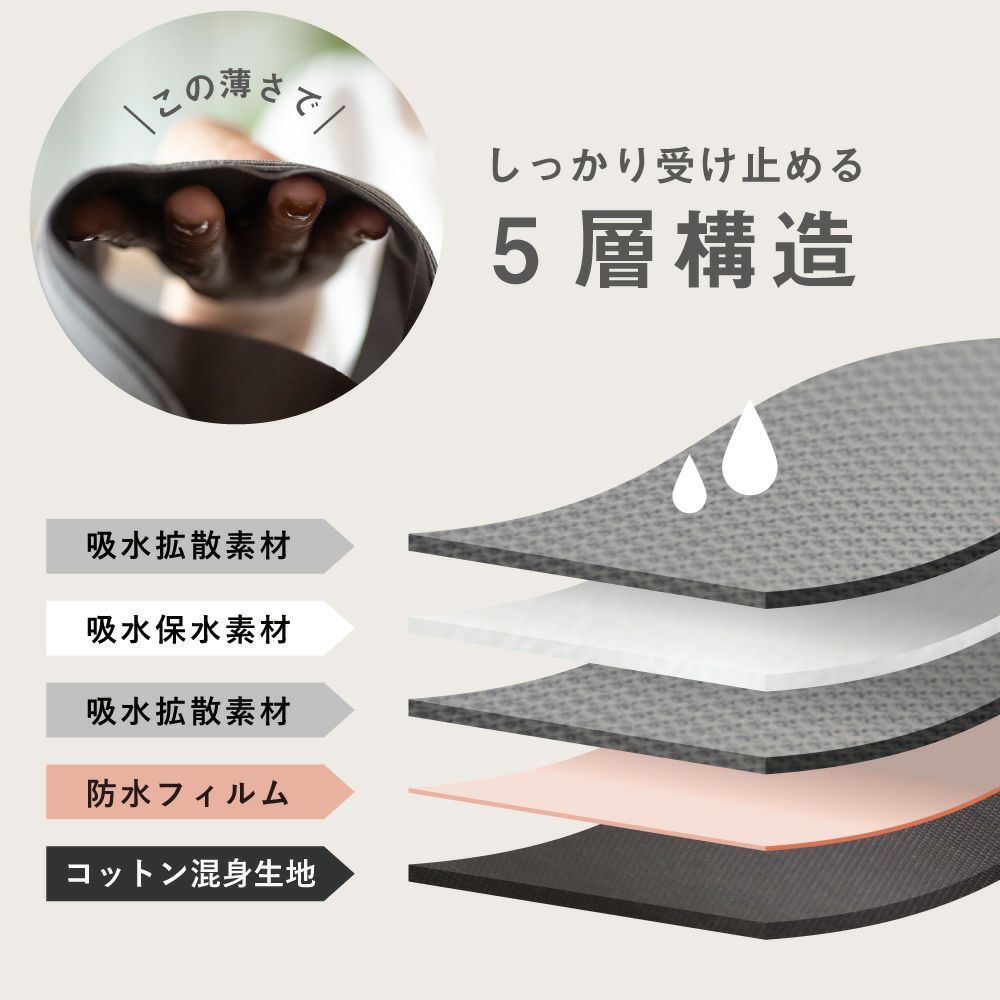 “気にならない”ための5層構造。 安心感があって、かつ快適な着心地を作る吸水部分は、薄さに見合わぬ5層構造。