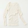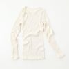 ![]() とろけるようなタッチで、ずっと触れていたくなる。 オーガニックコットンのなめらかインナー。 hinna ふわリブ オーガニックコットン クルーネックインナー ゴムを一切使用せず、ふわんとマシュマロのような肌ざわり。 きゅうくつな着心地や肌への刺激など身体が日々感じているストレスをくつろぎに変える、オーガニックコットンのクルーネックインナーです。 お腹までしっかり包み込む安心感のある設計。 袖口などささやかな部分まで肌あたりのよく仕上げ、溶け込むように身体に心地好くフィットします。 それでいて身体のラインに美しく沿う繊細なタッチを兼ね備えています。 とろんと柔らかなリブ生地には、綿花をつくる土壌から、生産者とその家族の暮らしにまで目を配るbioRe PROJECTによるオーガニックコットンを使用。 編みから染色に至るまでも、その風合いと魅力を最大限に守り活かす技術を採用しています。 身体を思いながら、世界のモノにまつわる問題に対しても向き合う糸口になれたら。 自分も、未来も気持ちよくなれる解放インナーです。 ![]() お肌に溶け込むような、やわらかさ。 クルーネックインナーを平置きすると、やや面長なシルエット。お腹までしっかり包み込む安心感のある設計です。 繊細に編み上げたリブニットの着用感は快適そのもの。やわらかな伸縮力で身体にフィットし、つっぱり感やきゅうくつ感を一切感じさせません。 丸胴の生地をそのまま使っているので、わきに縫い目がありません。内側のわずかな縫い目も、やさしい肌あたりの縫製仕様です。 ![]() ゆったりした作りながらゴワゴワ感もなく。 身体のラインにひらりと添うつくりにすることで、きゅうくつ感や張り付く不快感を軽減。ゆったりした作りながらゴワゴワ感もなく、ファッションへの影響も最小限。 オーガニックコットンのあたたかな安心感が、身体をふわんと守ります。 ![]() すそは厚みのない端かがり仕様で、自然とゆるいフリルのように。カットしたリブ生地のふちを国内で丁寧にメロウ処理しています。 身体のラインを拾い過ぎない絶妙な薄さとサイズ感でタックインしてももたつかず、すっきり。シルエットにも響かないさらりと軽い着心地を叶えます。 ![]() 首まわりは、太めのパイピングをほどこして型崩れしにくいように。 ![]() 継ぎ目のないbioReオーガニックコットンのさらっと1枚生地が、ゆるくドレープしてデリケートな肌に寄り添います。摩擦も少なく、開放的な着心地。 袖口などささやかな部分まで、生地のかがり処理を丁寧に。肌に触れたときの心地よさを最優先におつくりしています。 ![]() 外着の見た目で、くつろぐ優越感。 宅配便の受け取りやリモート会議。おうちで過ごす時間が長くなることに比例して、おうちにいても“きちん”とした格好で過ごすことも多くなったいまだから。 一日中軽い着心地でくつろぐための素材感やシルエットにこだわりながら、そのまま外に出かけられるような“きちんと顔”を兼ね備えました。 肌あたりが気になるお洋服のインナーとしても。 ![]() とろとろ柔らかく体に添う オーガニックコットン100%のリブニット。 クルーネックインナーの身生地は、bioReオーガニックコットン100%のとろとろとしたリブニット。 ふっくらと柔らかな肌触りで、身体のラインに合わせてとろんとキレイなドレープを描きます。 インナーで悩まされがちな肌にじっとり張り付く不快感もなく、ずっと触れていたくなるような着心地です。 着けていたっけ?と思うほどの解放感で過ごせます。 ![]() ブランドネームもオーガニックコットンでお作りしています。 気になる方は取り外してご使用ください。 ※ブランドタグにつきましては、現在は肌に当たらないように乗せ縫いの仕様となっております。 ![]() 透明な材料で、透明なものづくりを。 持続的な発展のために世界が抱える大きな問題と綿花栽培は、密接に関係しています。 hinna オーガニックコットンシリーズでは、それを見て見ぬふりすることが無いよう、綿花をつくる背景から編み上げまでのすべてを厳格に管理しています。 材料となる綿花は、公正な契約によってタンザニアのオーガニック農場で作られるbioRe COTTONを使用。 GOTS(Global Organic Textile Standard)認定工場で、他の原綿の混入を防ぐべく厳重な管理のもと紡績された糸は、国内有数のニットの産地 和歌山で、長年の経験と技術によって1枚の生地になります。 仕上げの加工も、専用のレシピで水の汚染を最小限に抑えたもの。洗いの工程は、ドイツSONETT社のオーガニック洗剤で行われています。 国内の縫製工場で丁寧に縫製し出来上がったお品は、米ぬか原料のパッケージに入れてお届けします。 ![]() 未来に種まきする、bioReコットン。 hinna クルーネックインナーの身生地(アンダー、後身頃部分除く)に使用しているbioRe COTTON。インドとタンザニアで展開されている、世界で最も規模が大きく、最も最先端を行くプロジェクトのひとつbioRe 