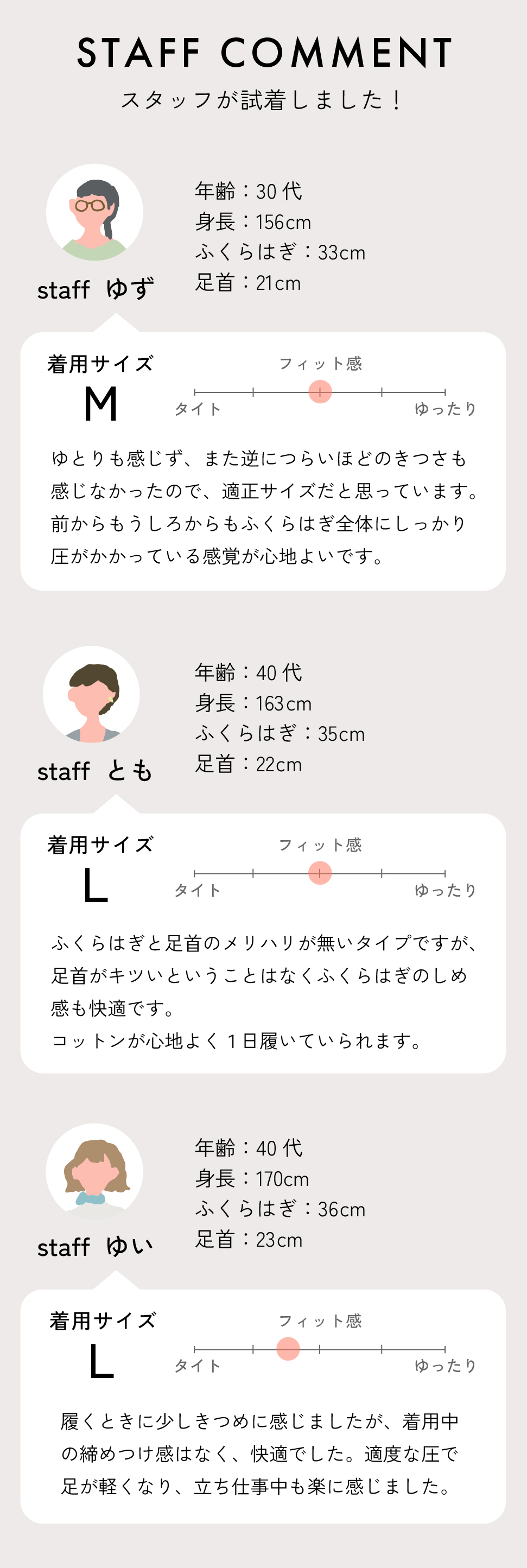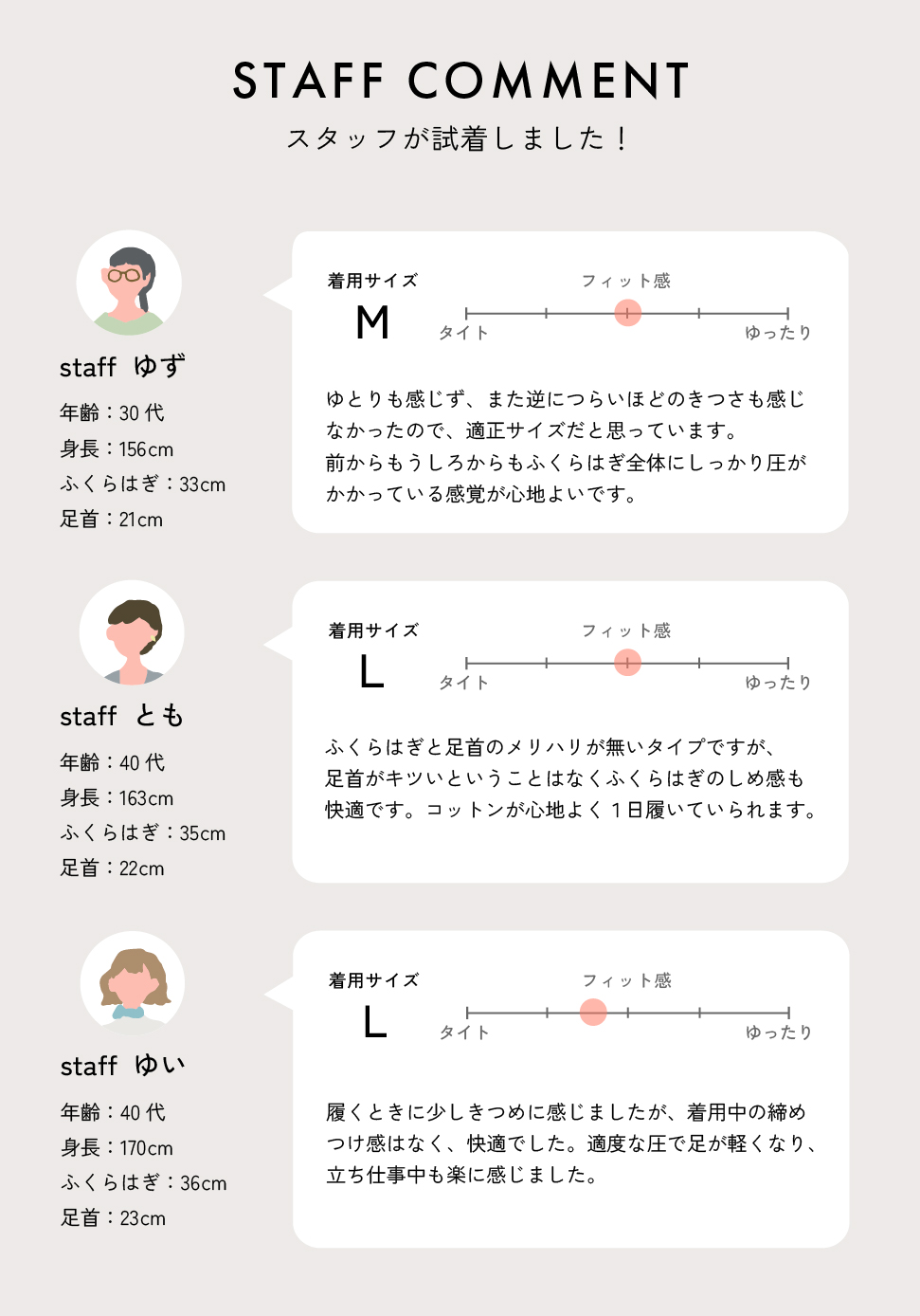 しっとり優しい質感に、履き口も足首も締め付けない心地よさ。 「キツい」を我慢せずにはける、しっかり医療基準の着圧サポーターです。 ふくらはぎは27hPa、足首は37hPaと、リンパや血流が停滞しやすい足元のむくみをやわらげ、巡りをうながすにはじゅうぶんな加圧。 なのにふしぎと窮屈感がないのは、しっとり肌に馴染むコットンの素材力と、 はき口と足首にひとクセある独自のかたちのおかげ。 弾性サポーターの締め付け感が苦手な方も、それを忘れて普段どおり過ごせる キュッとやさしい履き心地に仕上がりました。