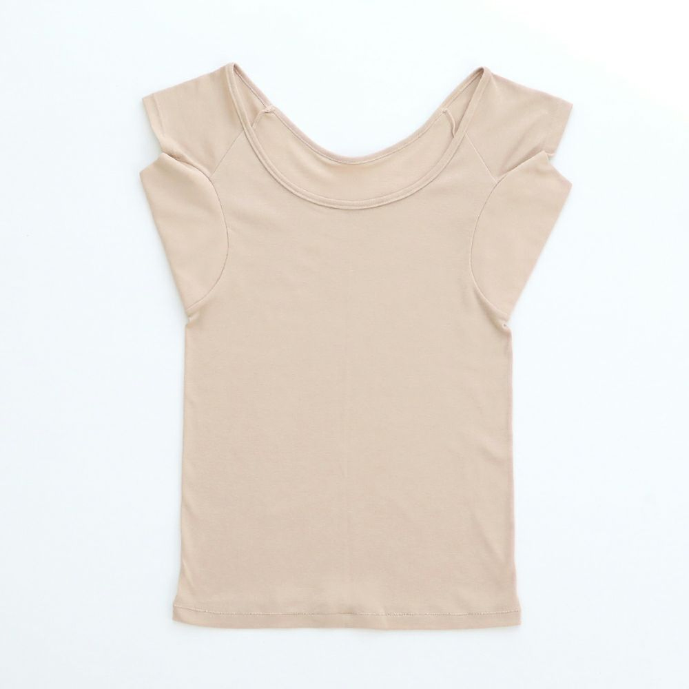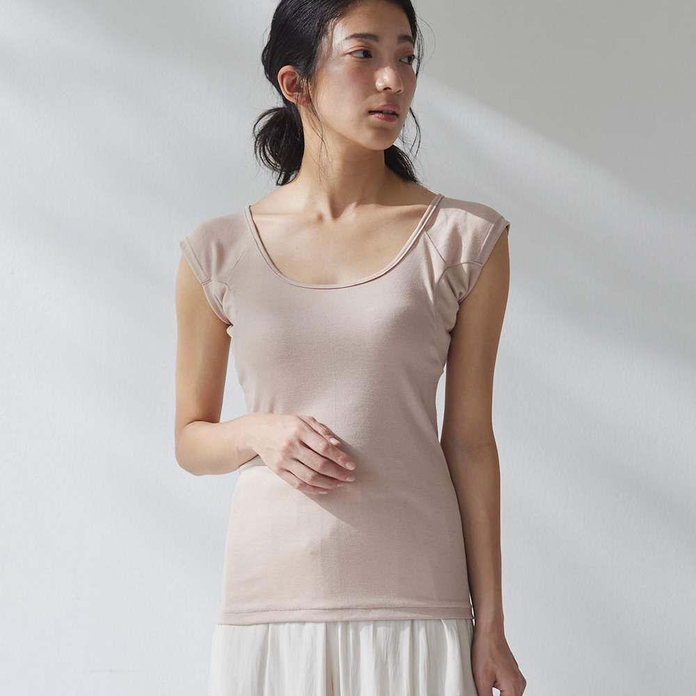 フレンチ袖+大きめ脇パッドで、汗をしっかりキャッチ。綿混素材で肌あたりがやさしく、通気性も兼ね備えています。