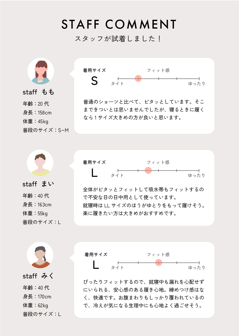 究極に透けない「コーラルベージュ」 「究極に透けない」ことを目指したコーラルベージュ。 ![]() 見つめる、耳を澄ませる、 時間をつくる。 自分も、親も、娘も。同じ女性の身体を持つ私たちが抱える、誰にも言えない悩みの数々が、ようやく近年、ひも解かれるようになりました。一生付き合っていくこの身体、向き合うことは自然なことです。 ゆらぎ続ける女性の心と身体。締め付ける「あるべき」をほどいて、ただ心地よくいられる時間を。じっと耳を澄ませて、内側に心を向けられる時間を。 hinnaはそんな時間にふわりと寄り添うために生まれた、SANTE LABOオリジナルブランドです。 ![]() お客様のお声を受けて、2023年5月にサイズ感を改良いたしました。これまでモレの不安感が軽減されるようフィット感のある設定にしておりましたが、大きめサイズを購入されるお客様が多かったため、通常サイズでお選びいただけるよう改良しております。