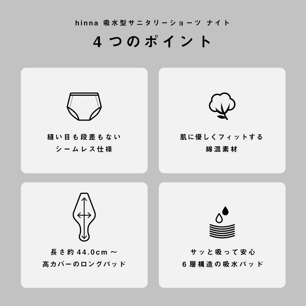 「吸水ショーツ=衛生面が不安」を解消したのがシームレスなhinna 吸水型サニタリーショーツ。ふつうの日&昼用タイプ。