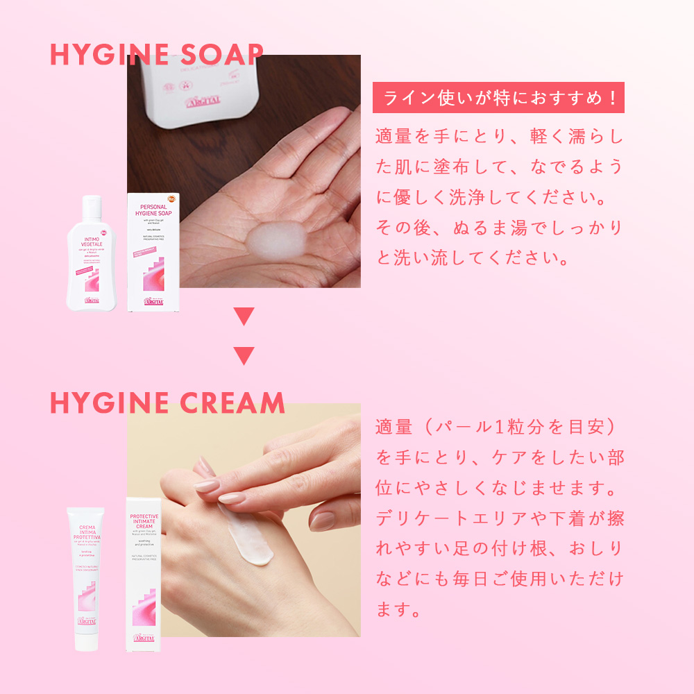 適量(パール1粒分を目安)を手にとり、ケアをしたい部位にやさしくなじませます。デリケートエリアや下着が擦れやすい足の付け根、おしりなどにも毎日ご使用いただけます。 | セットで使って、より心地よく