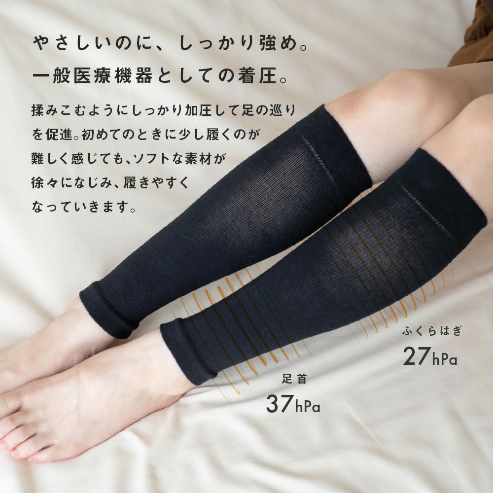 コットンのやさしい質感で、医療機器基準の着圧なのにゆるやかな履き心地。手もみのようなしなやかな圧感でリラックスする、「きゅうくつじゃない」むくみケア。