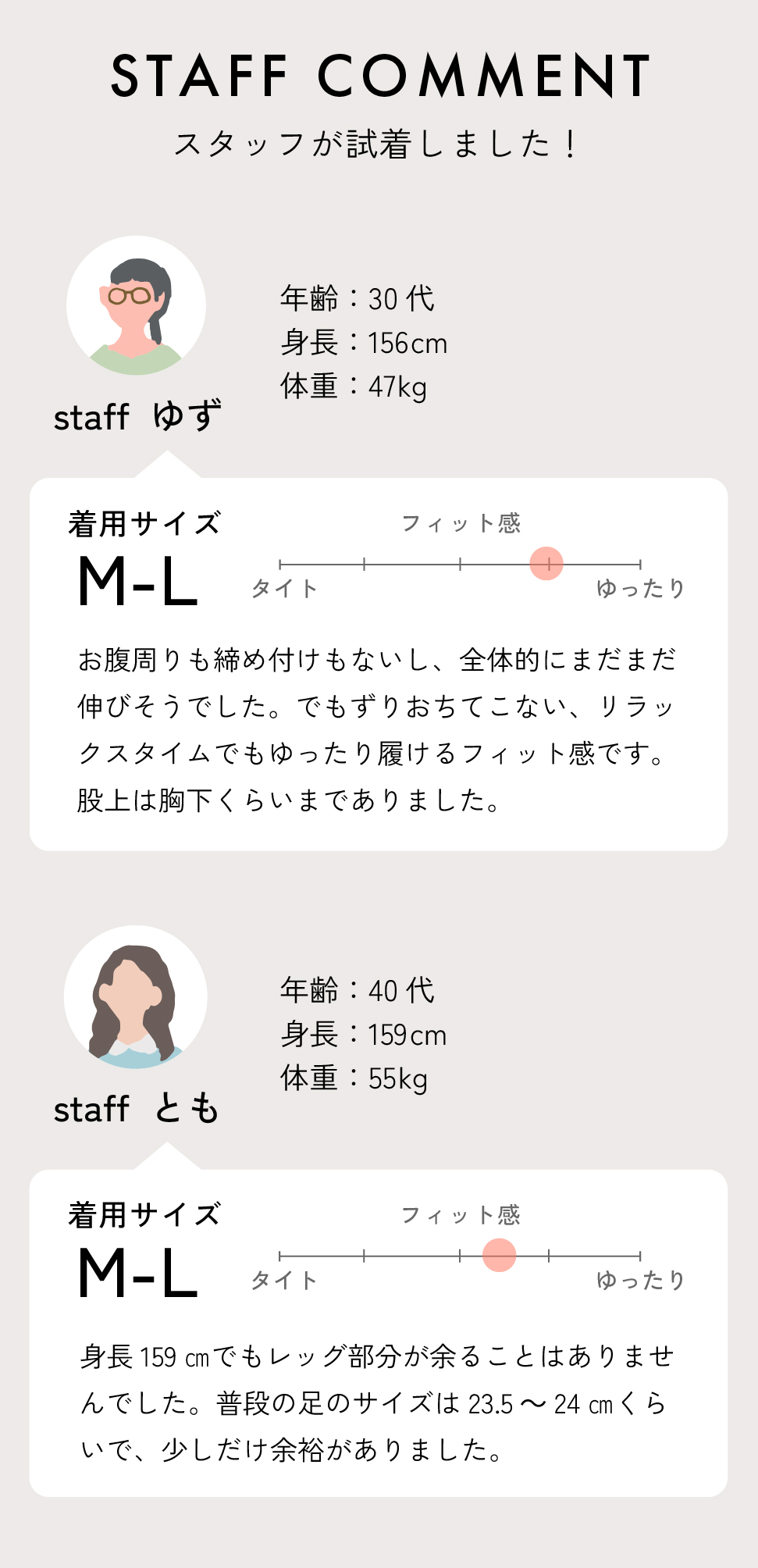 圧迫感を最小限に。 ウエストはゴムを使わず、リブ仕様に。ウエスト部分の食い込みや圧迫感を出来る限り少なく、お腹周りにやさしくフィットします。 足の動きにフィットする立体的なマチ 心地よい着用感のひみつは、マチが立体的なつくりになっていること。 足形だから、履きやすい つま先とかかとの形をとることで、フィット感をアップ。靴下のように履けて、着用時のごわつきも解消します。 補強糸を編み込んで、長く使えるように 傷みやすいつま先とかかとには補強糸を編み込んでしっかりとした生地に。つま先の穴あきや、かかとの擦れを気にすることなく長く着用いただけます。 COLOR カラーはどんなコーディネートにもマッチするブラックと、抜け感で足元を軽やかに見せるチャコールの2色。