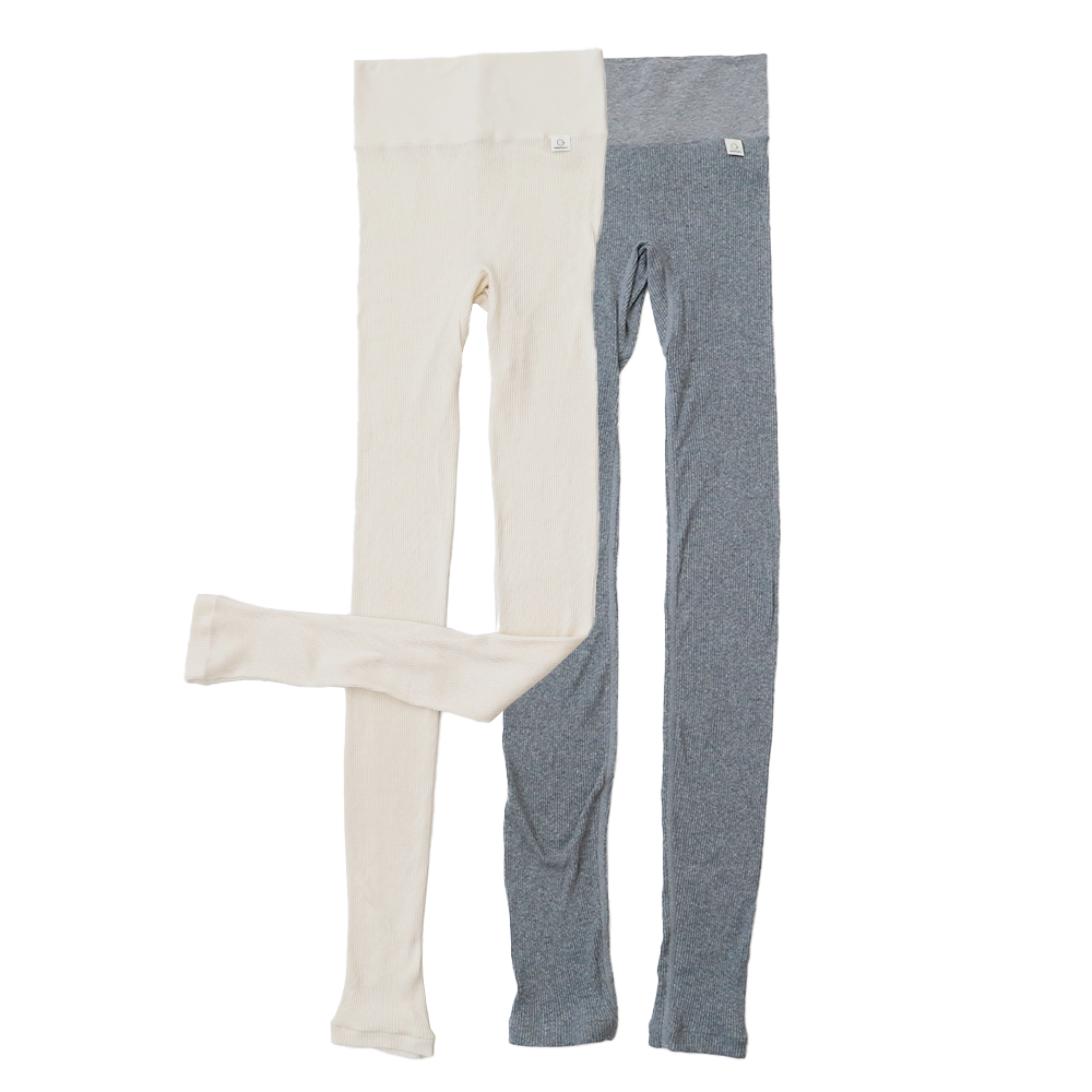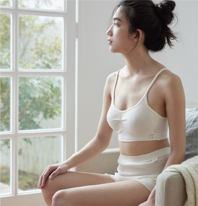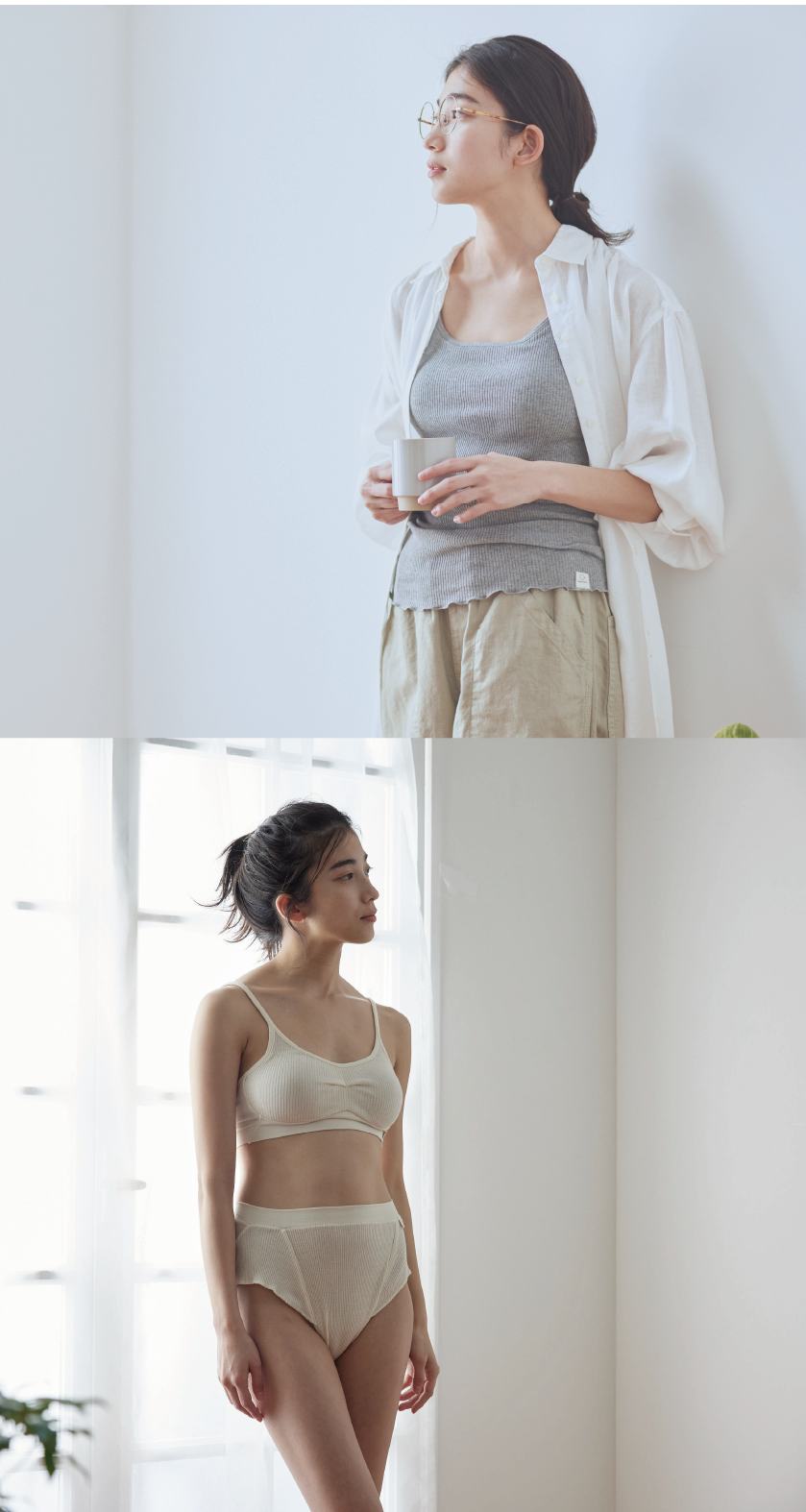 ブラのアンダー部分や肩紐、ショーツやレギンスのウエスト部分に至るまで、どこにもゴムは使用していません。オーガニックコットンに伸縮性のある極細の糸を編み込んだ帯のような生地が、フニフニとやわらかく伸縮して身体のラインにそっとフィットします。