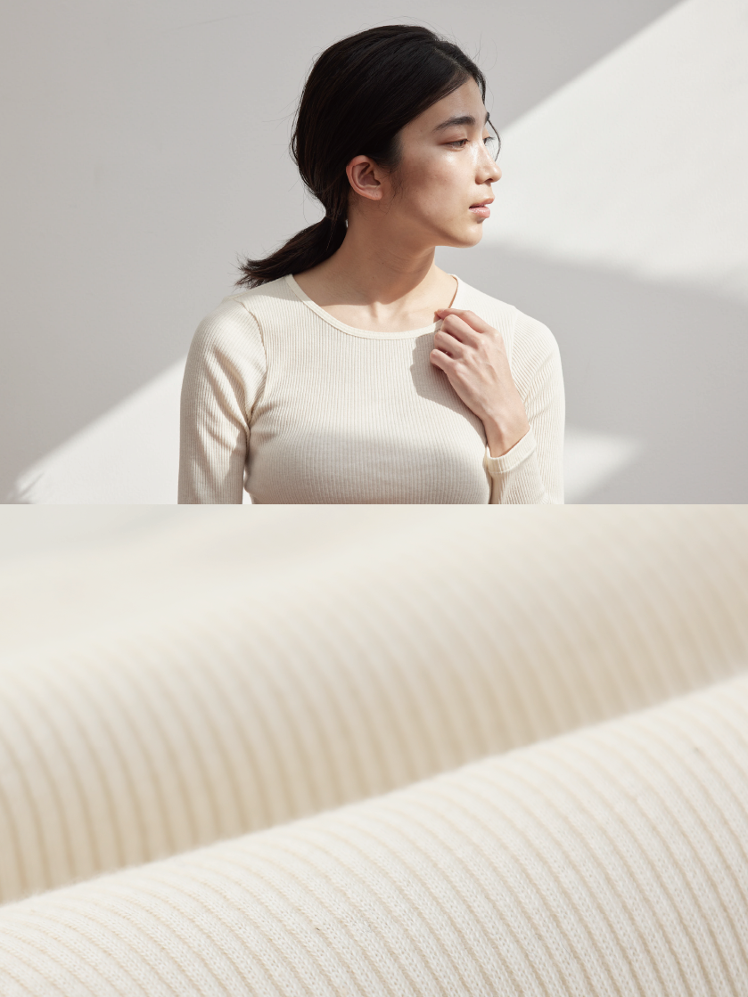 GOTS(Global Organic Textile Standard)認定工場で厳重な管理のもと紡績されたオーガニックコットン糸を使用した、とろとろとしたリブニット。