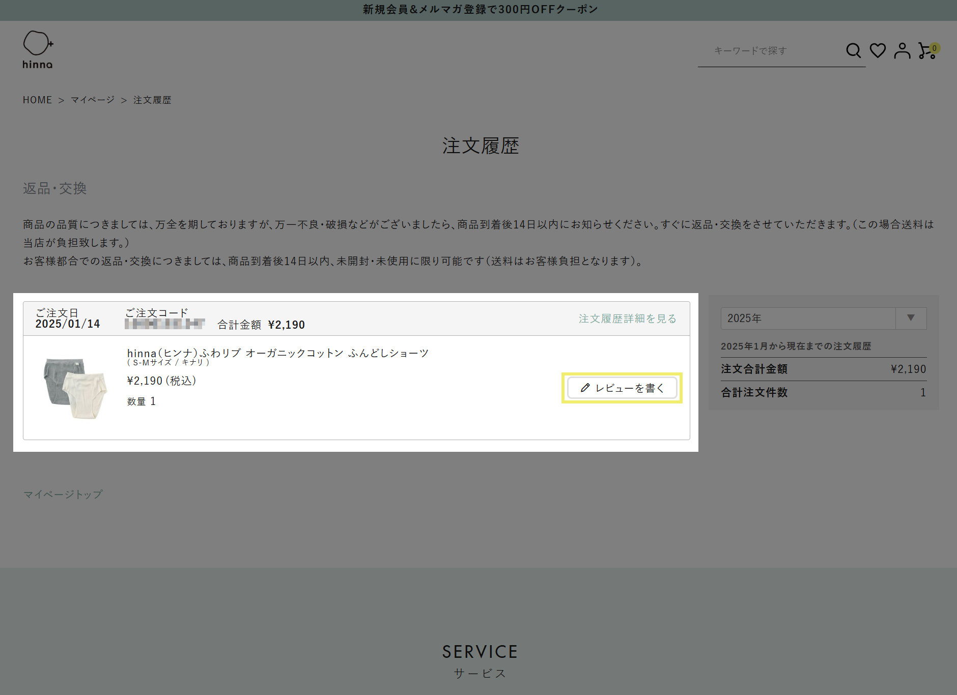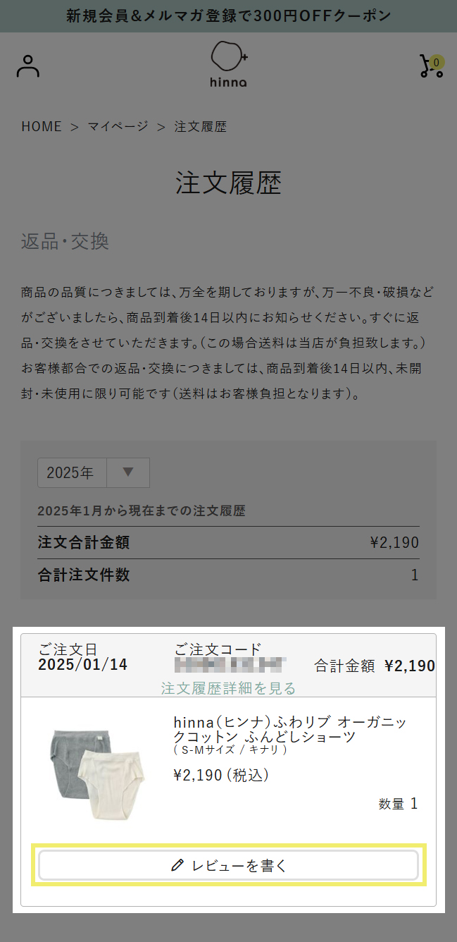 注文履歴画面から、hinna 対象商品の「レビューを書く」をクリック。